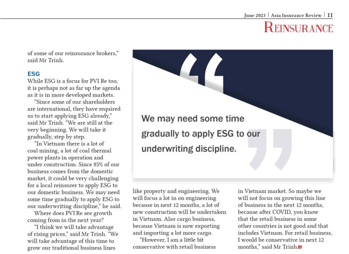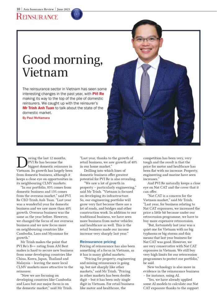 2023-06-12Good morning, Vietnam 0.Log in to post comments8 viewsLoại nội dungNewsHanoi Re NewsCho phép tải fileOffBanner PVI Re Annual General meeting of shareholders: Rise to the Number 1 of the reinsurance market 2022 Information disclosure: Decision to increase PVI Re’s Charter Capital to VND 1,044 billion by the Minister of Finance