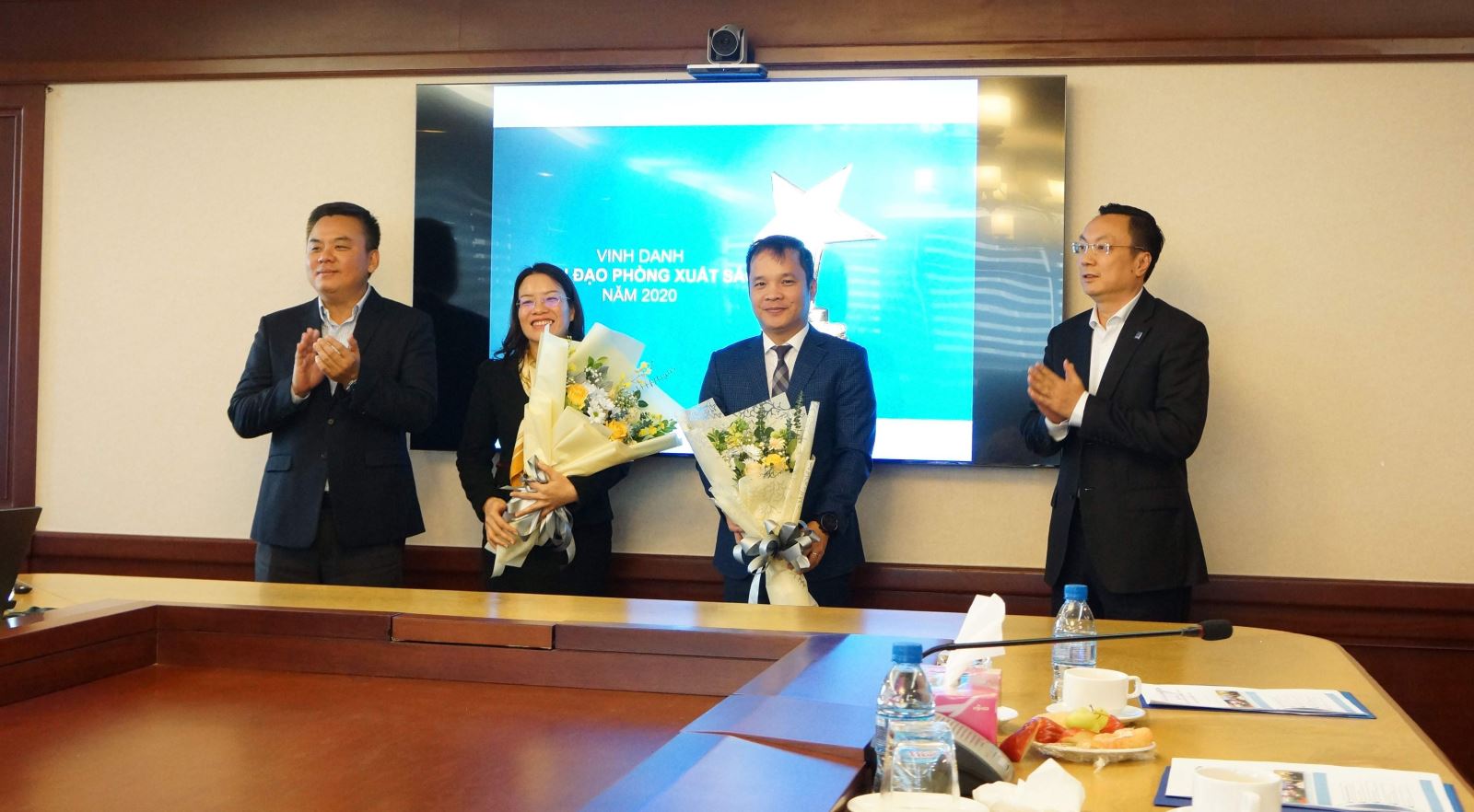 Ông Nguyễn Xuân Hòa – Phó CT HĐQT PVI Holdings và ông Đoàn Linh – Thành viên HĐQT PVI Holdings trao tặng Tập thể xuất sắc năm 2020